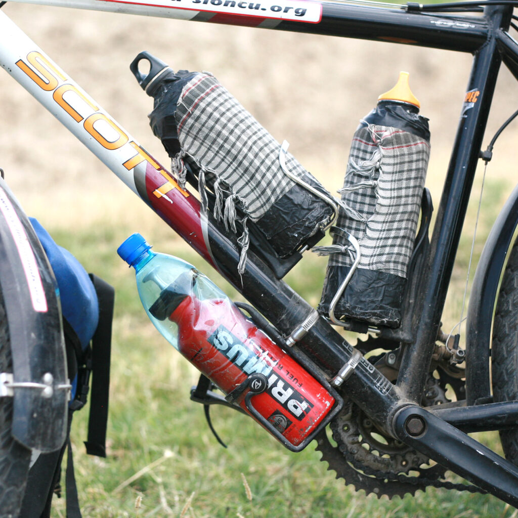 Butelkę z paliwem można wygodnie zamocować pod ramą roweru. Jeśli rama nie ma odpowiednich otworów, sprawdzą się metalowe obejmy dostępne w sklepach motoryzacyjnych.
